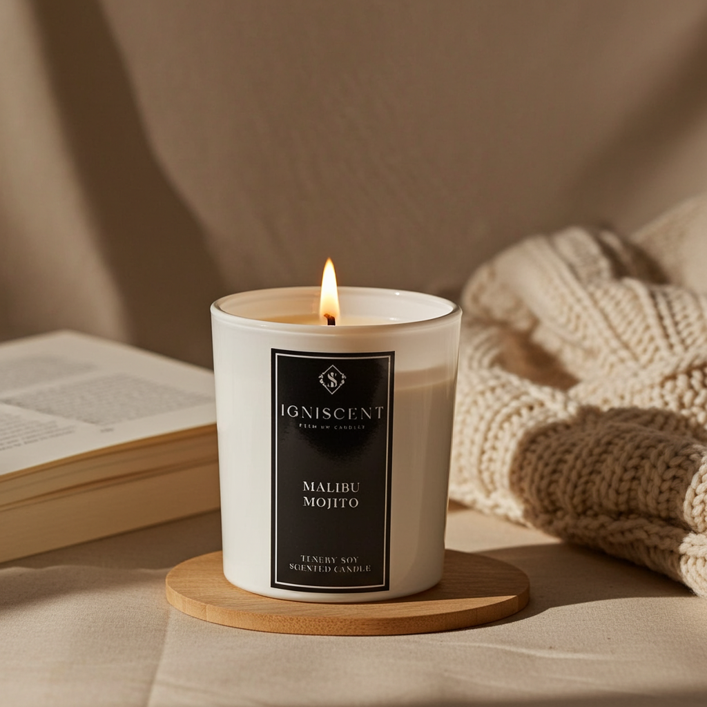 Laat je meevoeren naar zon, zee en ontspanning met de Malibu Mojito vegan geurkaars van IGNISCENT. Deze handgemaakte, duurzame sojakaars brengt de sfeer van een tropisch strand rechtstreeks naar je huis.